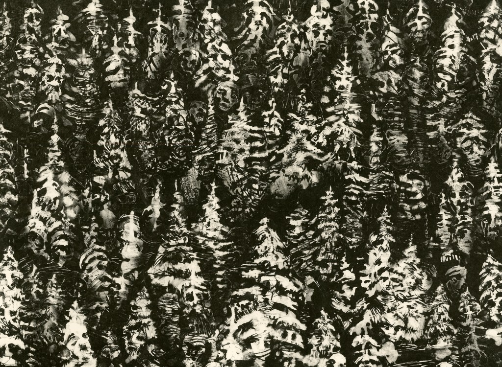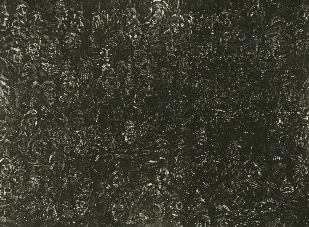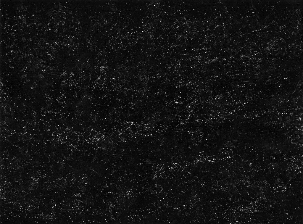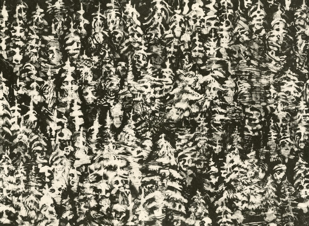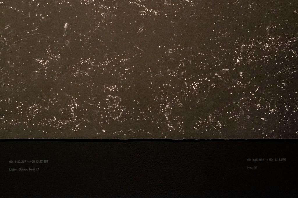 one, printed on rag paper, and mounted on a black wall with screen-printed captions at the bottom. The six lithographs are variations of the same image, showing a field of people’s faces gradually transforming into a sea of stars. The captions of text running along the images use source materials from the movie “Dead Poets Society” and from N.Kazantzakis work “The Saviors of God; spiritual exercises”. Creating a dialogue with the images, the text personalizes the experience of the changing images, reaching out to the viewer to really “hear” what is happening.