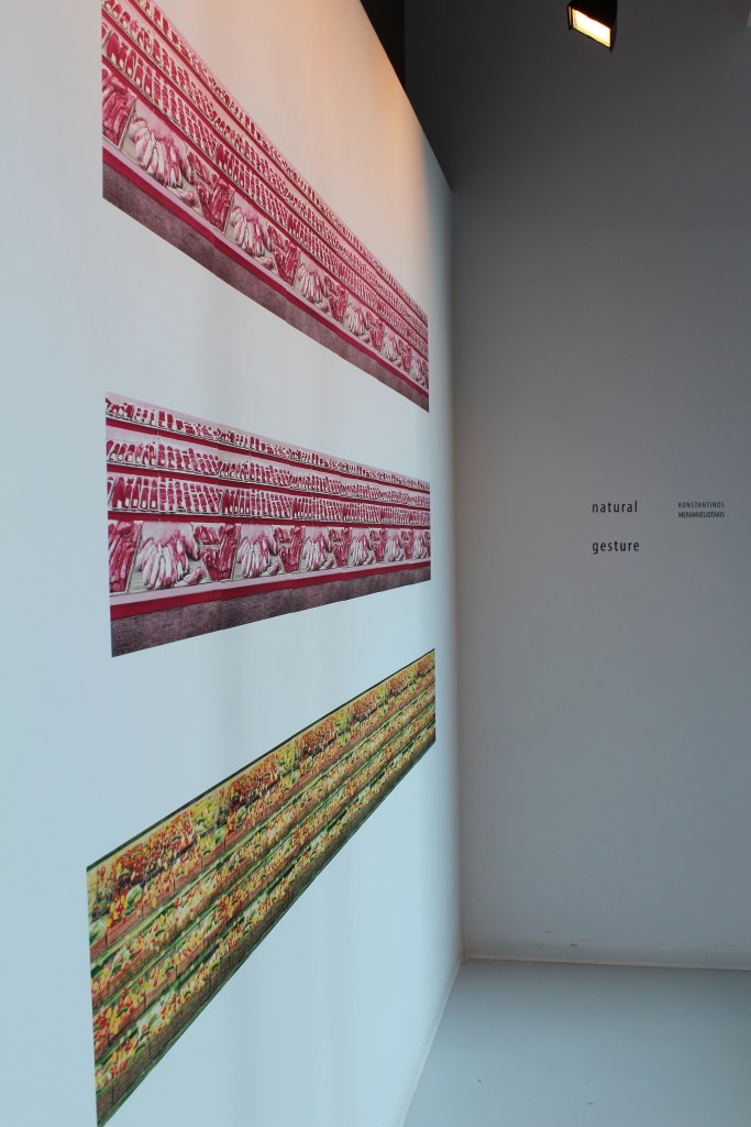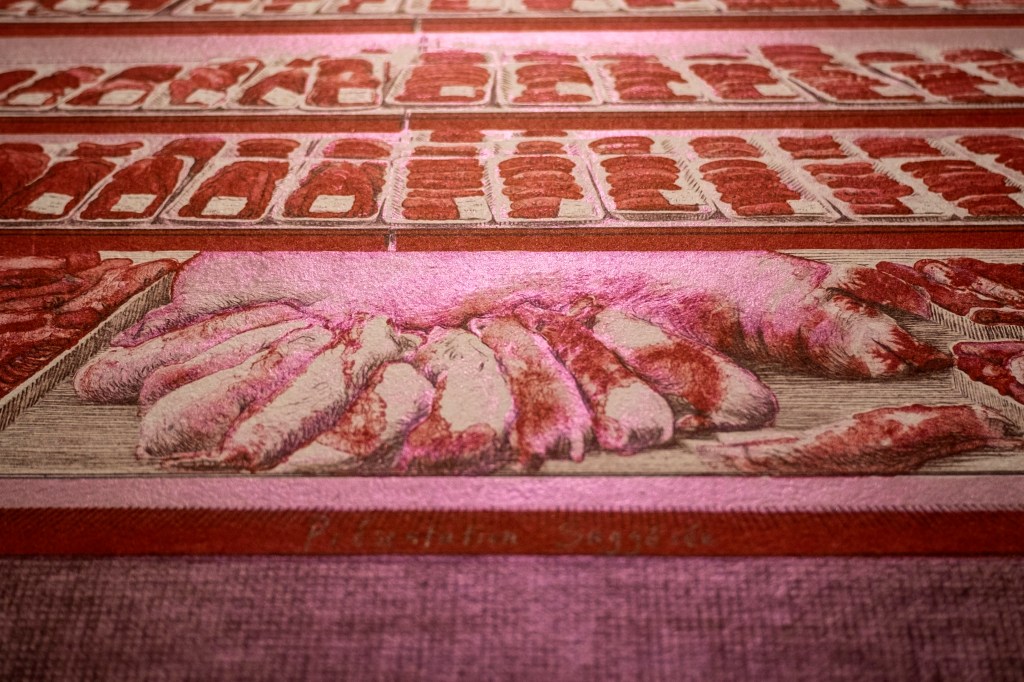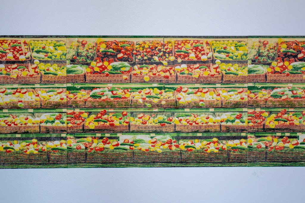 “Serving suggestion” is a print installation composed of two editions of lithographs. One edition shows a supermarket meat display, and the other edition shows a supermarket vegetable display. It measures 84 inches by 55 inches, and it is printed on Japanese paper which is wheat-pasted on the wall.