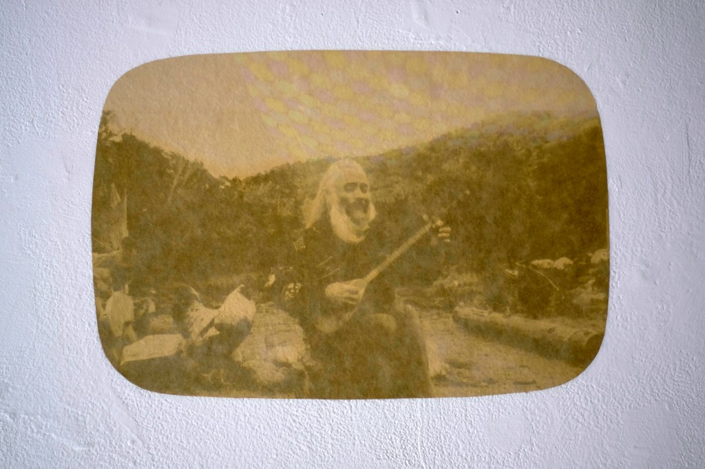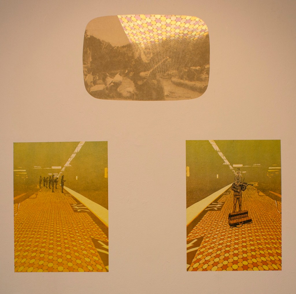 “The birds” is a wheat-pasted mural print installation composed of three prints arranged in a triangular scheme each one measuring 15 by 11 inches. The two prints showing the platform of a metro station are reduction linocuts coming from the same matrix; One is printed in the direct method and the other one in the offset one. The figures of the musician on the one, and the crowd waiting on the other, are printed in lithography. The third print is a photo etching on Japanese paper incorporating one layer printed in lithography. The digital image, showing a man playing music at the country, is a photomontage from the video “Dertli Dolap” by Özgür Baba published on Youtube.