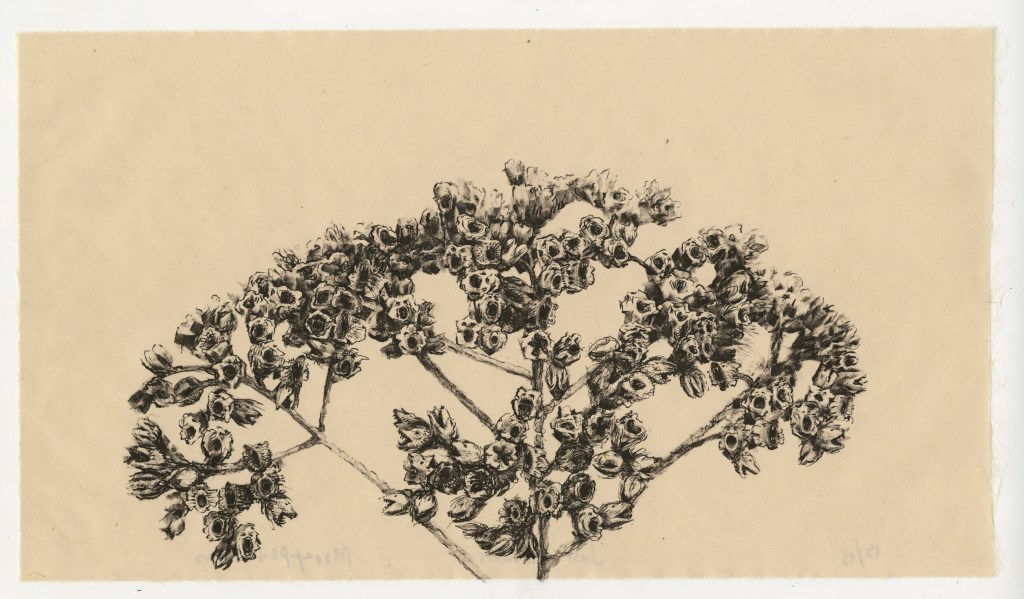 The Cry is a printed mural installation composed of two lithographs juxtaposed vertically, and found packaging material, all wheat-pasted on the wall. The lithograph on top was printed by Lourdes Santandreu Planas at the Tamarind Institute. It is an image of flower clusters that I drew from observation considering the idea of transubstantiation in Kazantzakis work,