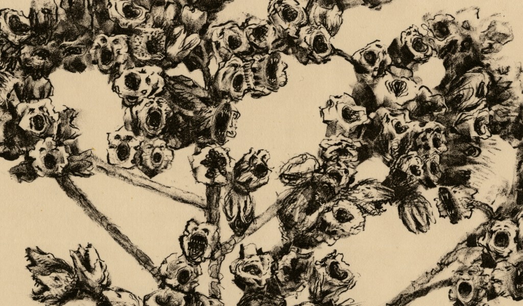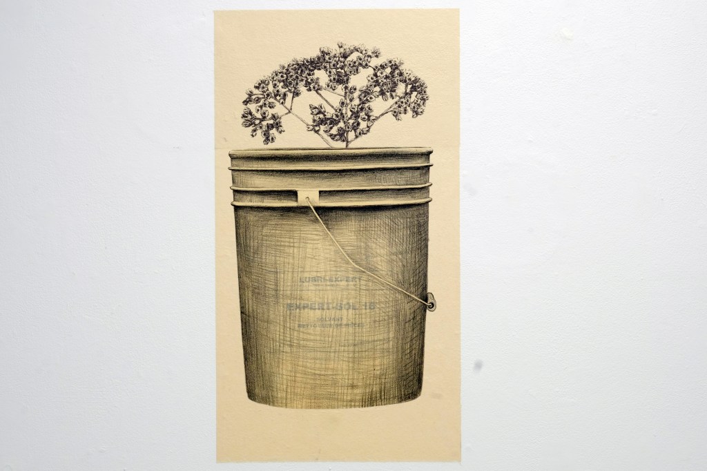 interpreting each floret as a crying animal. The lithograph at the bottom shows a bucket through which the spectator can make out a faded commercial logo.